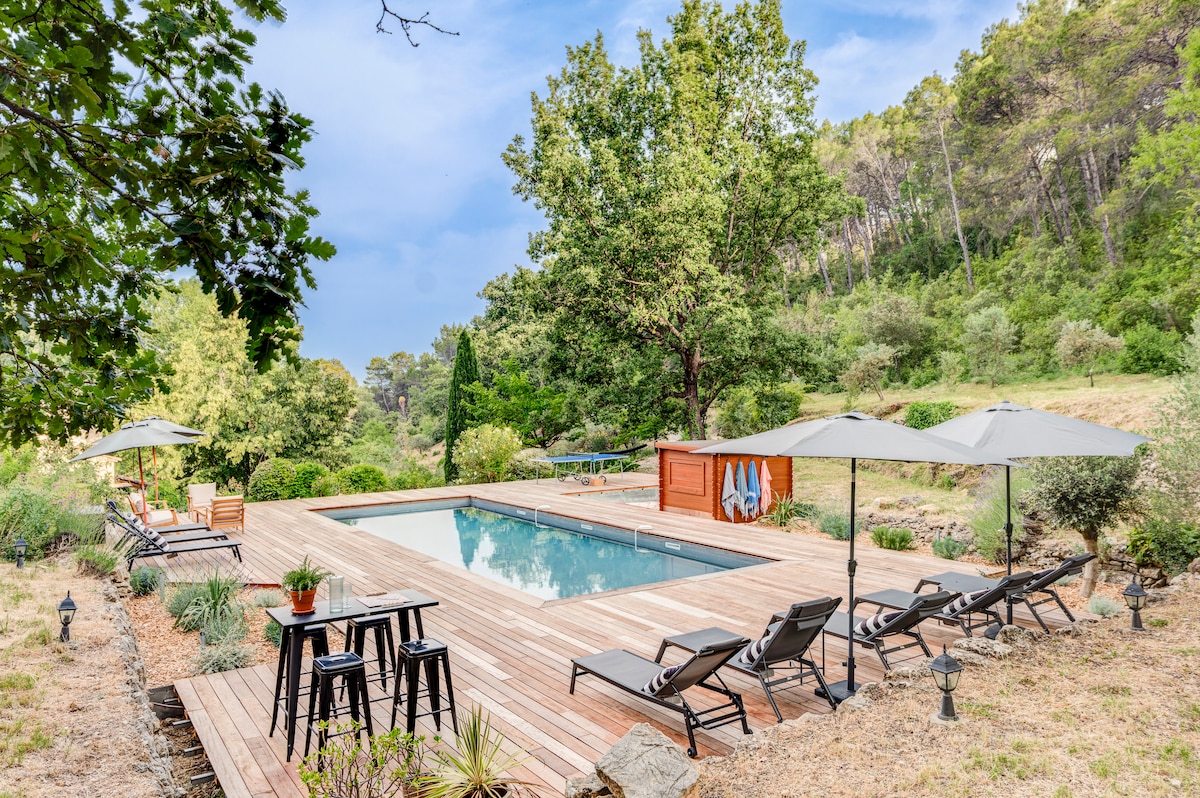 Maison insolite au fond des bois. En Provence verte, lovée entre forêts, oliviers, garrigue et vignes. Feu de bois en hiver, piscine, terrain de pétanque, petite sieste, moment de méditation, de yoga ou lecture sous la pagode dans la forêt. En pleine nature dans un environnement exceptionnel. Cabanon tout confort et climatisé, au calme pour se ressourcer et se déconnecter. Stationnement. Clôture pour nos amis les animaux. Vacances idéales pour visiter des lieux magnifiques.