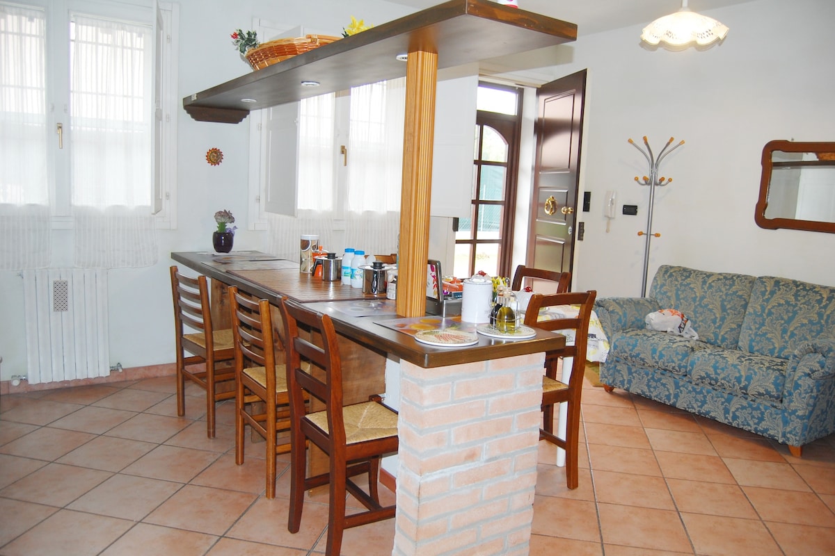 újonnan felújított, funkcionális és barátságos lakás, vidéki stílusban berendezett és gyönyörű parkkal felszerelt. Pihenhet a kertben vagy a felszerelt terasz alatt. műholdas TV, ingyenes wifi és kerékpár áll rendelkezésre. Ideális egyének vagy gyermekes családok számára. Üdvözöljük a négylábú barátokat. Információs anyag is rendelkezésre áll a területről és annak tipikus termékeiről. Félúton Ferrara és Rovigo között, 3 km-re a Palladian villa Badoer.