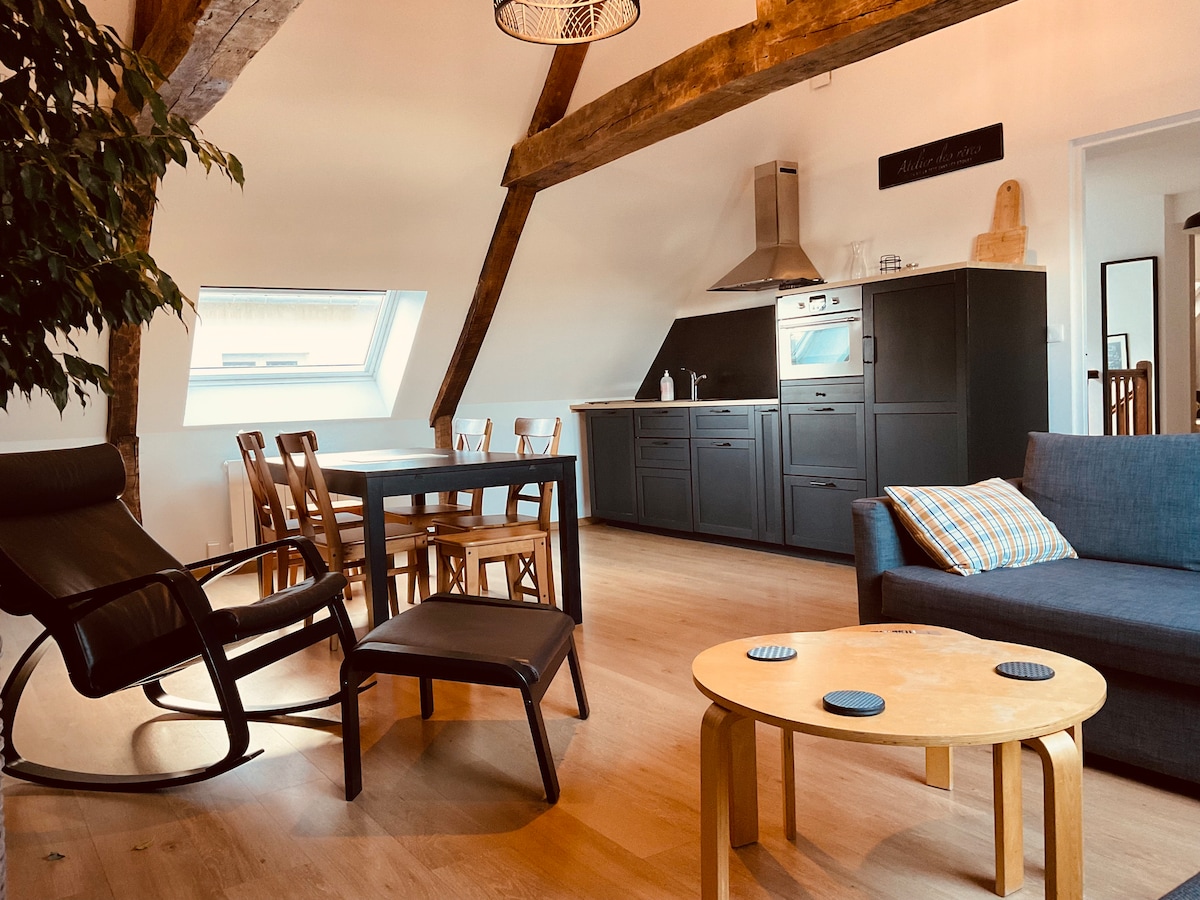 A „head in the stars” lakás a 2. és az utolsó emeleten található, lift nélkül, a tető alatt, egy régi házban, Bayeux szívében, nagyon csendes környezetben. Legfeljebb 6 személy elszállásolására alkalmas. Minden üzlet, múzeum és étterem sétatávolságra található. Közel leszel a partraszálló strandokhoz (10 km-re Arromanches városától). Az ár tartalmazza a saját parkolóhelyet.