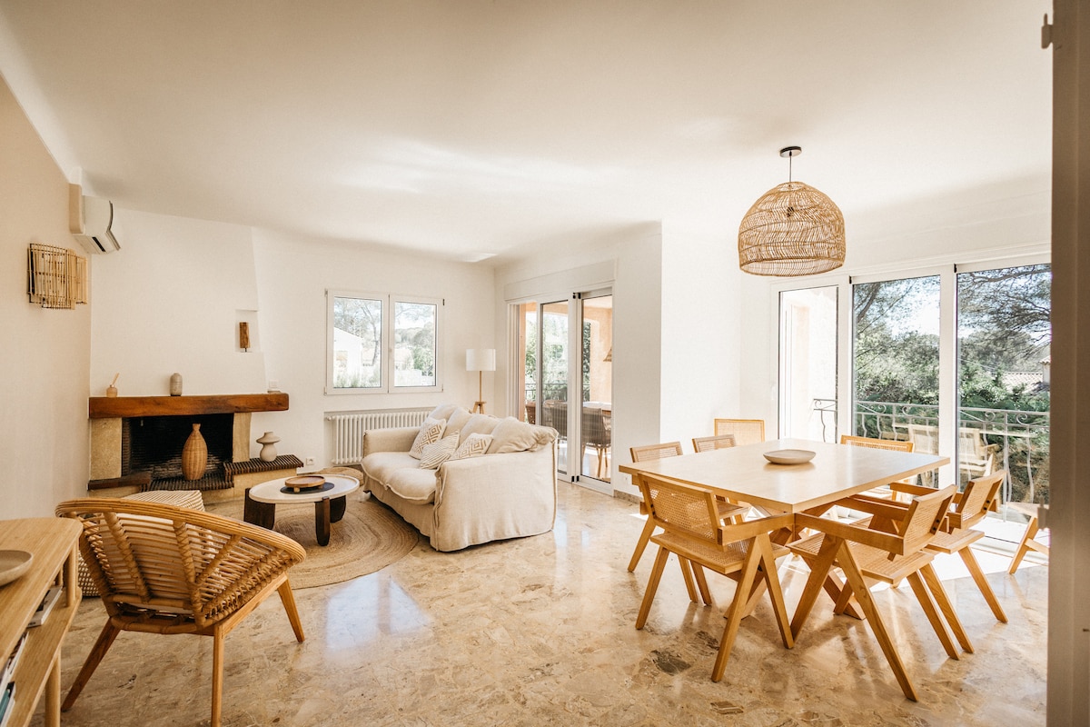 Spacious Provençal villa close to the beaches, ideal for a peaceful stay. It features 4 air-conditioned bedrooms, two living rooms, an open kitchen and several terraces. Large landscaped garden with a 10x4 m swimming pool heated from April to October. Petanque court, ping pong table and BBQ. Just minutes from beaches and shops. Perfect for family holidays or stays with frien