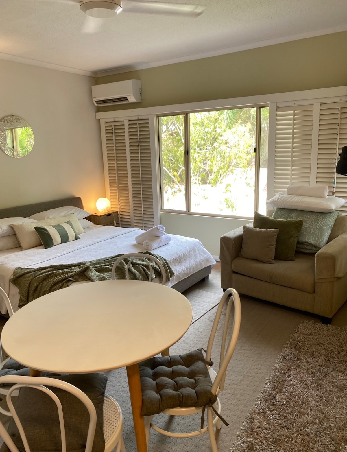 Tágas, szállodai stílusú stúdiószoba a Ramada Resortban. A stúdió önkiszolgáló, néhány konyhai felszereléssel (vízforraló, Nespresso gép, mikrohullámú sütő, hűtőszekrény) és nagy fürdőszobával rendelkezik. A stúdió saját INGYENES Wi-Fi-vel rendelkezik. A szoba nagyszerű helyen található az üdülőhelyen belül, amely buja esőerdővel és csodálatos medencével rendelkezik. 5 perc sétára van a strandtól. Vedd figyelembe, hogy a Ramada Port Douglas csendes végén található - autóval vagy transzferbusszal körülbelül 10 percre van a városközponttól.
