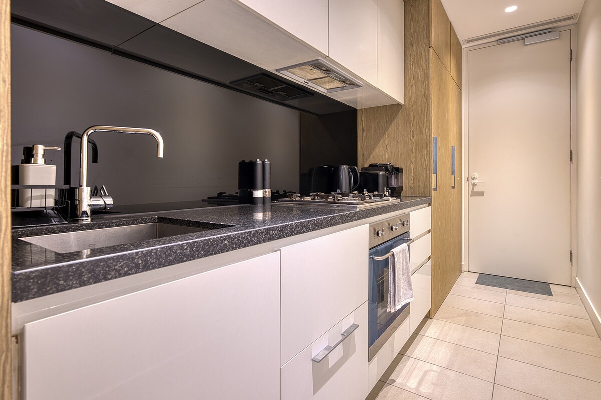 Welcome to my apartment with breathtaking city views. Nestled in the heart of Fitzroy Street, St Kilda, this urban oasis offers a comfortable stay for solo adventurers or couples. As you step inside you'll find everything you need from a well equiped kitchen and a living room with both a 2 seater and 3 seater couch and a 75inch TV. The master bedroom has a glass window wall allowing a dazzling city view from your bed. With its soft lighting and minimalist design, you will be well rested.
