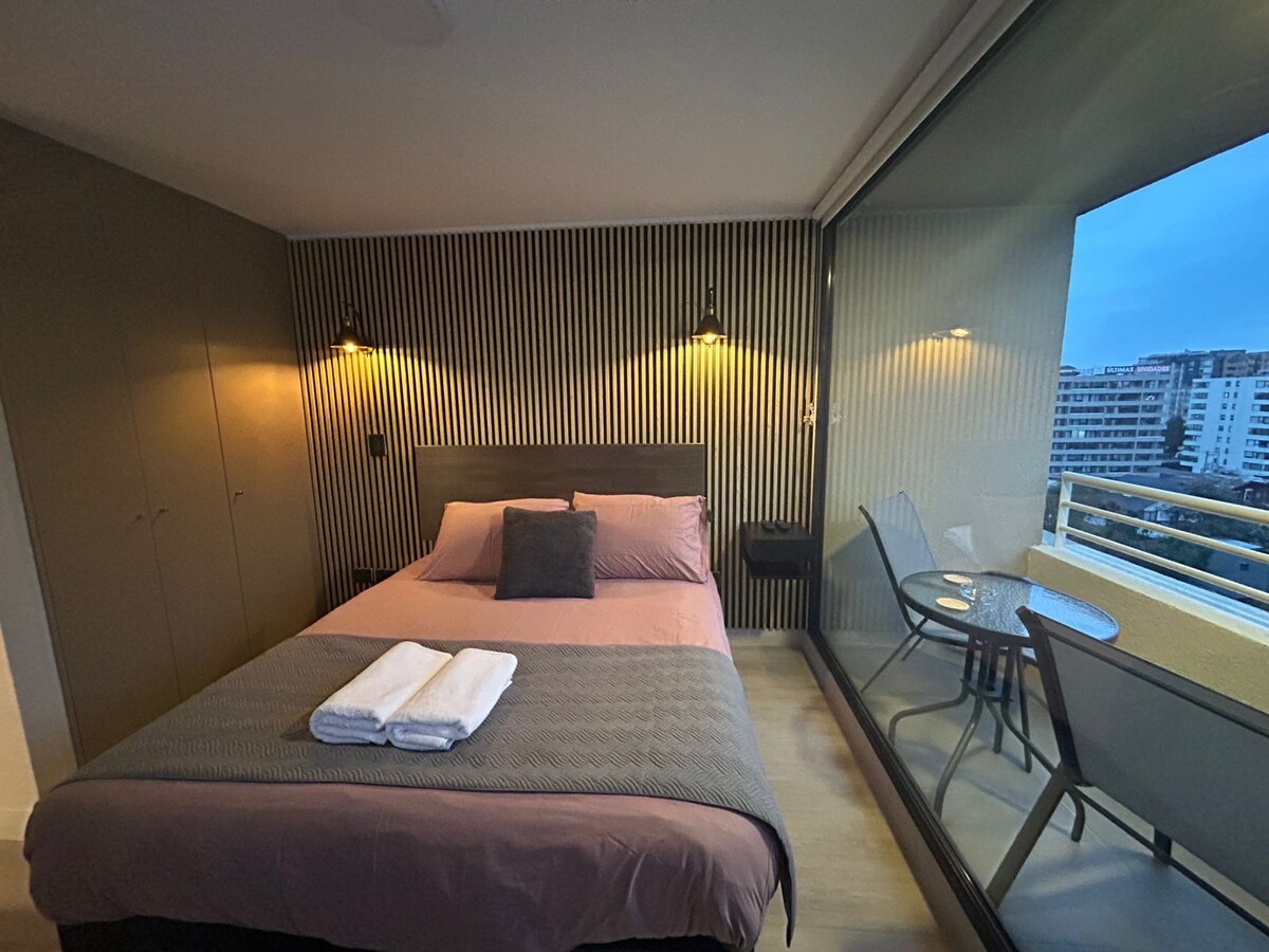 Új és otthonos executive stúdióapartman, minimalista vintage stílus, kényelmesen kondicionálva két ember számára; pár lépésre a Strip Centertől, ahol szupermarket, gyógyszertár, kisbolt és éttermek találhatók, Clínica közelében, számos egyetem és Plaza Dreves közelében. UFRO 15 min U Catolica 10min Új készülékek az Ursus Trotter termékcsaládból. Ágy, ágynemű és törölközők a Rosen termékcsaládból. Csendes lakás, ideális otthoni irodához. Kiváltságos kilátás a 12. emeletről PARKOLÁST IS TARTALMAZ!