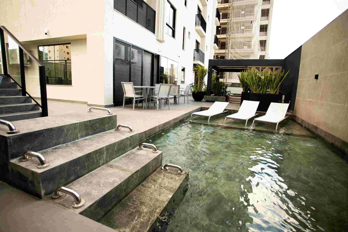 Szállj meg egy szálloda kényelmében és egy lakás szabadságában az itapemai JD Village-ben. - Kétszemélyes ágy extra ággyal és nappali kanapéággyal (legfeljebb 4 vendég elszállásolására alkalmas) - Teljes konyha – Wi-Fi | okostévé -1 parkolóhely – Lakóközösség úszómedencével, edzőteremmel és modern közös területekkel. – Néhány percre a strandtól. Exkluzív előny Szállodai szolgáltatások recepcióval, reggelivel, szervezett érkezéssel, takarítással és ágyneműcserével. Rua 238, nº 315 – Meia Praia, Itapema/SC, Brazília.