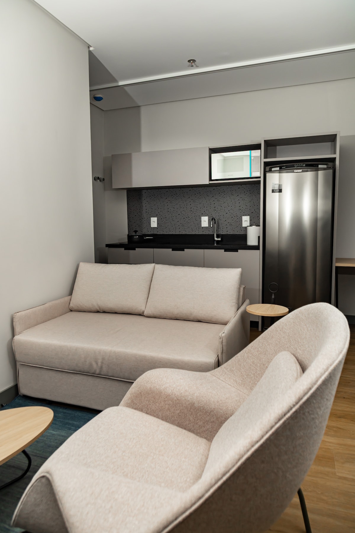 Flat em hotel 5 estrelas ⭐⭐⭐⭐⭐ O apto ocupa espaço no mesmo edifício de um hotel, porém, não temos serviços de hotelaria como troca de roupa de cama ou toalhas. Toda a área de lazer PODE SER USUFRUÍDA pelos hóspedes (como academia, spa, restaurantes, piscina) - 1 quarto de casal (roupa de cama e banho inclusas) - 1 vaga de garagem para carros grandes - 1 Banheiro c/ secador de cabelo - Sala c/ sofá-cama, TV e mesa para 4 pessoas - Cozinha completa - Café da manhã no hotel disponível à parte