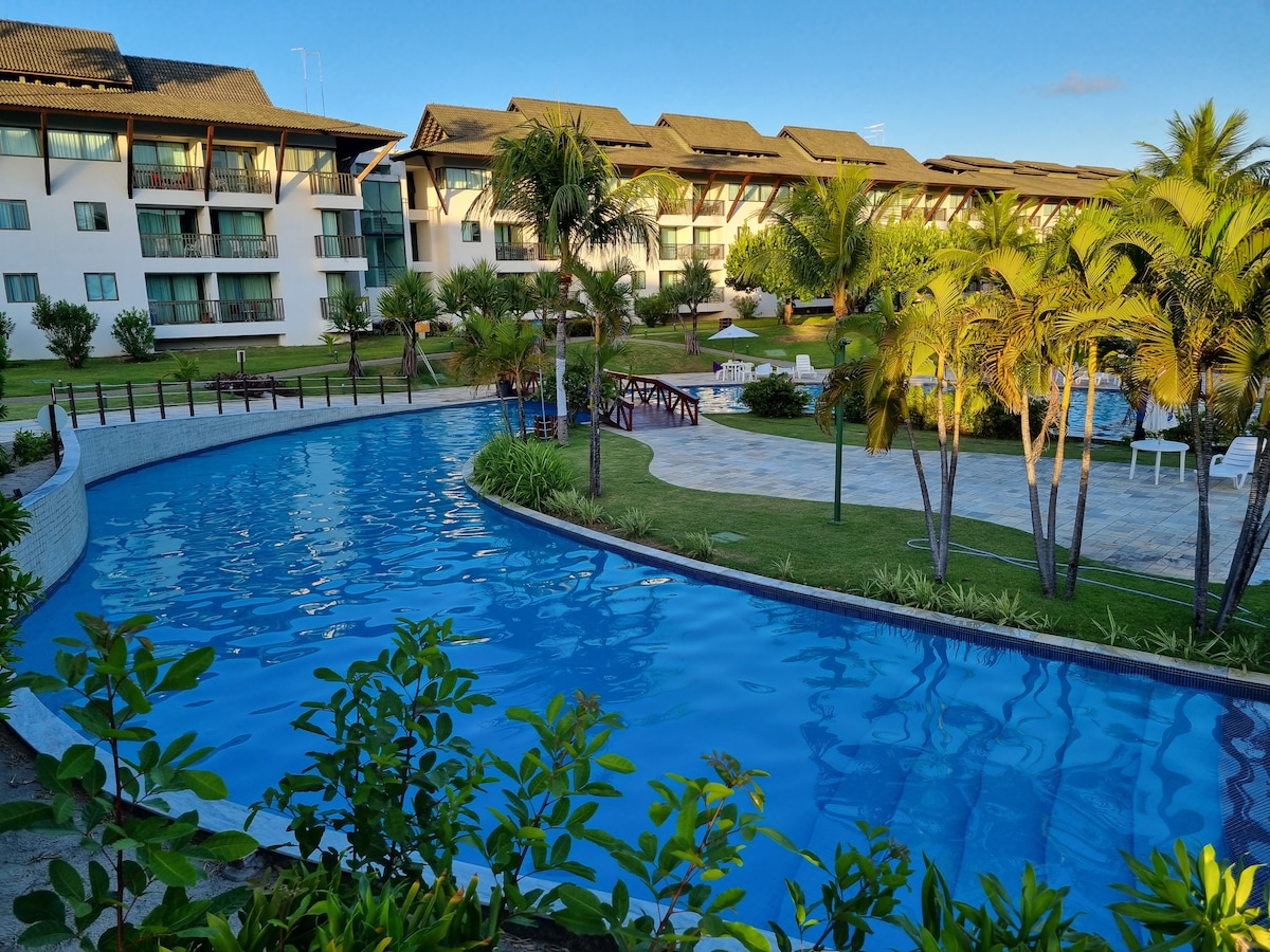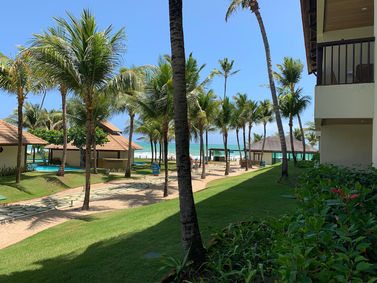 O flat é espaçoso com 45m² completamente equipado, condomínio beira-mar, pé na areia com guarda-sóis disponíveis: ✔1 banheiro ✔1 quarto com 1 cama de casal e 1 cama auxiliar ✔1 sala com sofá cama ✔1 colchão sobressalente ✔Varanda com vista para o mar ✔2 piscinas grandes com bar e restaurante ✔Quadras: poliesportiva, Volei de praia/futevôlei, beach soccer ✔Playground e Salão de Jogos ✔Academia e Sauna Parquinho infantil