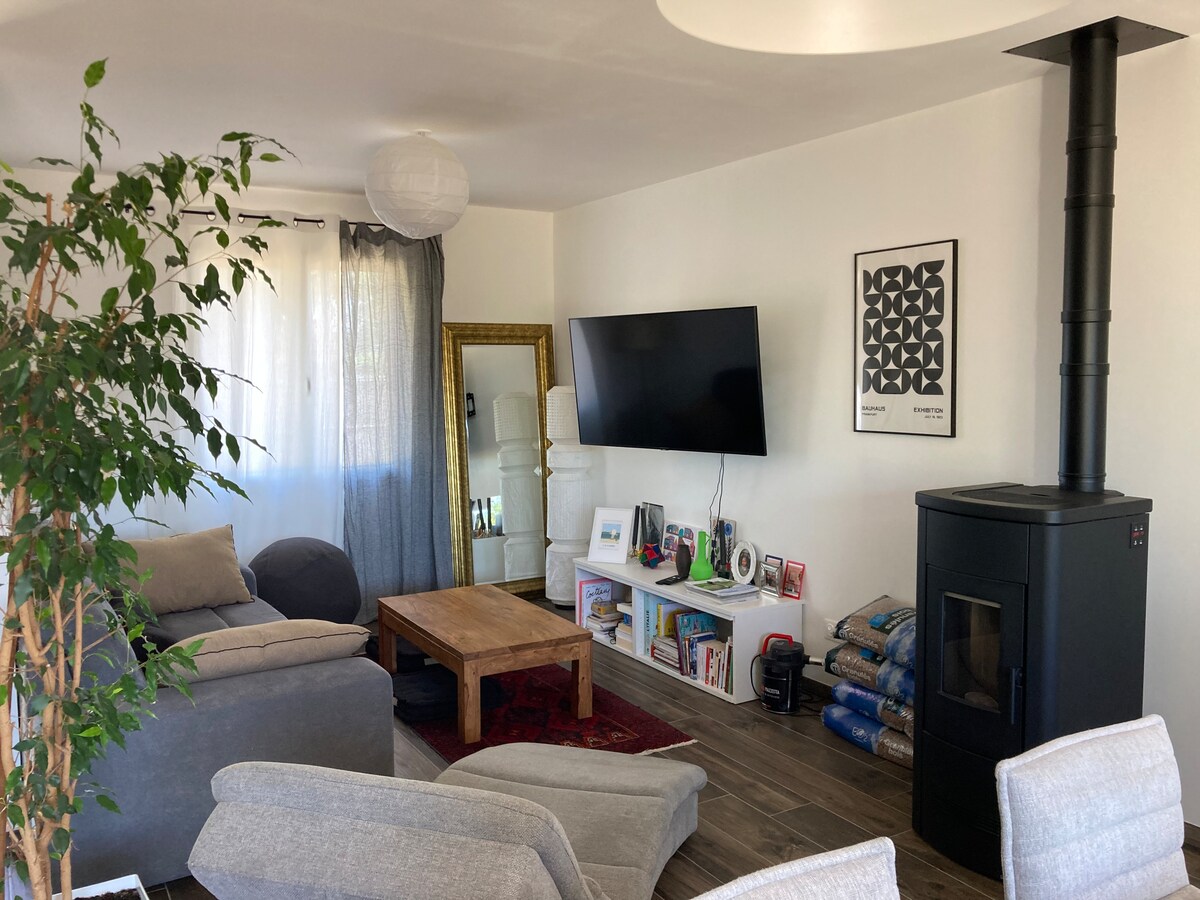 Üdvözlünk otthonunkban, Françoise-ban, Francisben és kedves kutyánkban, a Golden Retrieverben. Egy felújított melléképületben fogsz megszállni egy lépcsőmentes stúdióban, amely a parasztházunk udvarán található. A stúdió Egy szoba felszerelt teakonyhával, nappalival, íróasztallal és kétszemélyes ággyal, ahol kérésre el lehet szállásolni egy babát. Egy fürdőszoba. Elektromos fűtés.