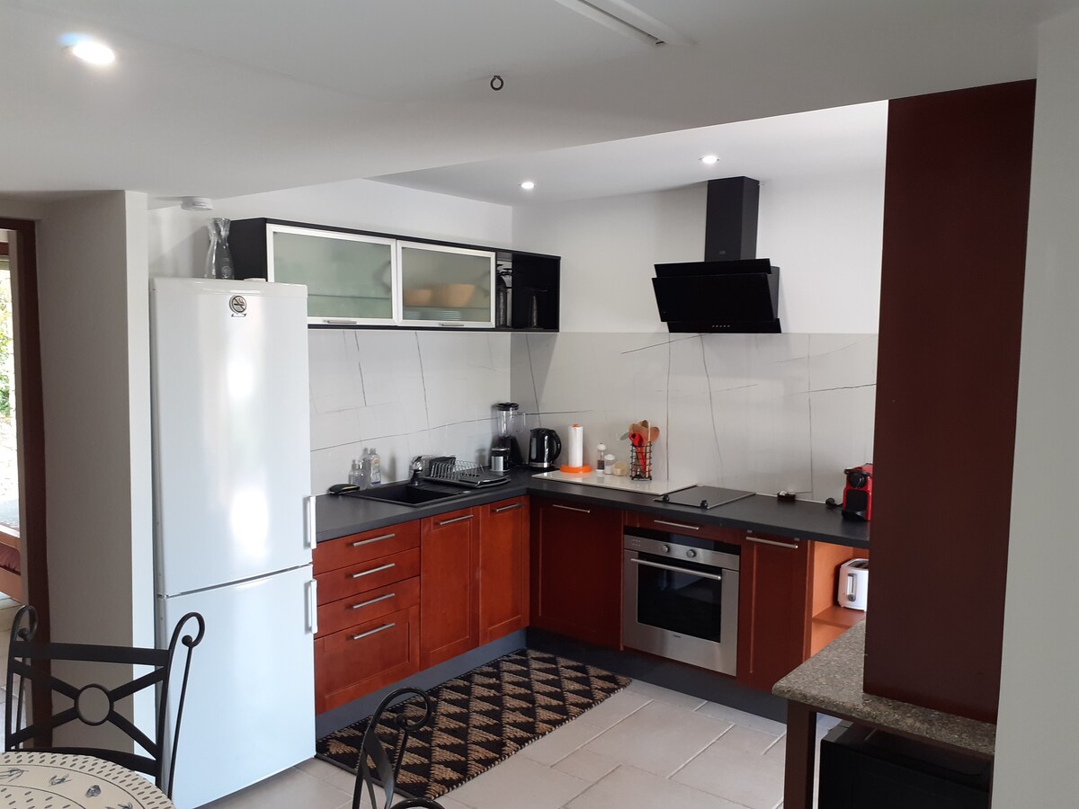 kiváló, nagy, teljesen felszerelt stúdió minden kényelemmel teljesen felújított ..... indukciós főzőlapos teakonyhából, szagelszívóból, hűtőszekrényből, érzékelésből, mikrohullámú sütőből áll.... egy 160 cm-es ágy nagy képernyős TV-vel és fürdőszoba zuhanyzóval van egy kültéri teraszuk, amelyen pergolas étkezés vagy napfürdőzés céljából lehet enni vagy napozni! Az úszómedence május 1. és október 1. között tart nyitva fűtés nélkül a villánk egy részén található, teljesen független bejárat... 10 km-re frongnantól 13 kilométerre Sète-től