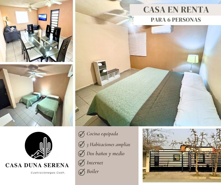 Alojamiento entero para ir a conocer el increíble pueblo mágico de Cuatro Ciénegas, Coahuila, ya sea por turismo, relajación o trabajo. Casa Maga cuenta con una hermosa casa completa, ideal para un viaje de hasta 9 personas distribuido en 3 habitaciones (2 camas individuales, 2 queen size, 1 king size, y 4 catres) 3 baños completos, sala, comedor, cocina, internet y patio con alberca ideal para un gran ambiente familiar.
