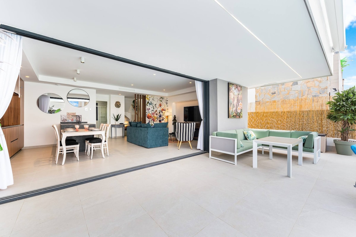 Golf, strand, barer, restauranter, storby eller rolig avslapping. Ta med familien eller venner og nyt dette elegante bostedet. Den helt nye luksuriøse villaen har en rekke fasiliteter. Privat hage og bassengområde med ulike sitteplasser, solsenger og grill, perfekt for avslapning utendørs. Du kan boltre deg over tre etasjer med en stor takterrasse hvor du kan nyte utsikten mot byen og mot havet. Aircondition og raskt internett. Vi tilbyr 3 dobbeltsenger 160*200 og 4 enkeltsenger 90*200.