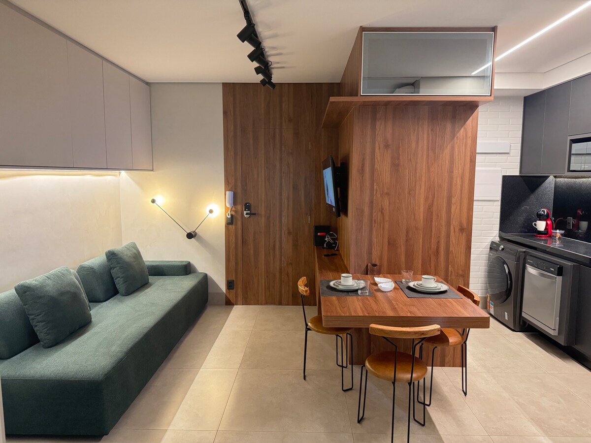 Modern lakás, 32m2, Sion legjobb pontján található. Konyhai edzés minibárral, főzőlappal, TV-vel (nyitott csatornák/Netflix), légkondicionálóval, hajszárítóval, elektromos vízforralóval és internettel. South Zone, next to JK Square and Bandeirantes Avenue, facing a Supermarket. Az épület teteje edzőteremmel, szaunával, úszómedencével, nappalival és közösségi konyhával (víz, jégkészítő). Igény szerinti takarítás áll rendelkezésre. Biztonságos épület 24 órás portaszolgálattal. *Garázs nem jár hozzá.