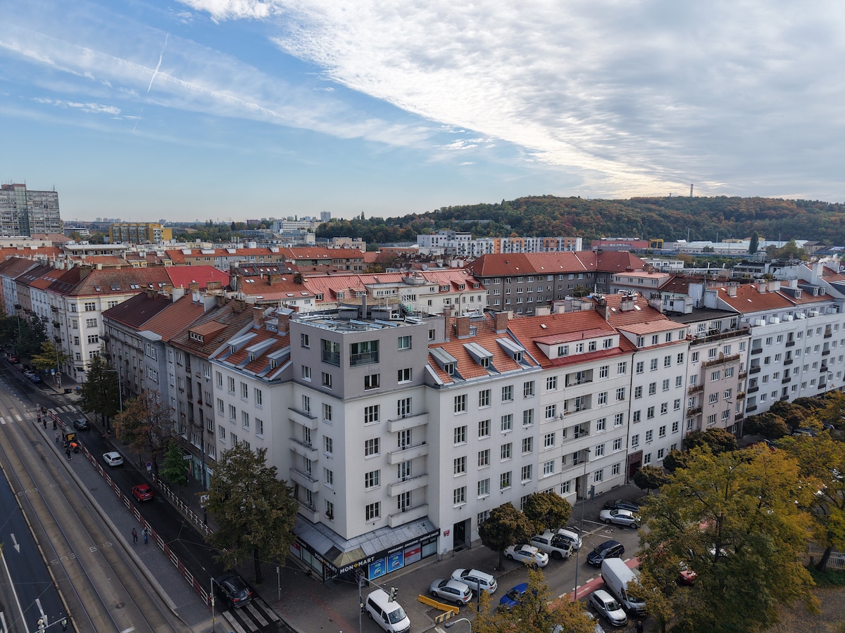 Tágas és világos hely unigue kilátással a régi, rezidenciális környéken. A fényűzően berendezett lakás a szálláshelyen eltöltött időd minden pillanatában kényelmet biztosít. Teljesen felszerelt konyha, fürdőszoba zuhanyzóval és fürdőkáddal lélegzetelállító kilátással, TV Netflix-szel, csendes hálószoba kényelmes ággyal. Kávézók, pékségek és bisztrók, pubok a legjobb cseh sörrel és konyhával, egy helyi piac a szomszédban. Közvetlen tömegközlekedés a repülőtérre, a vasútállomásra, a prágai várba, az óvárosi csillagászati órába.