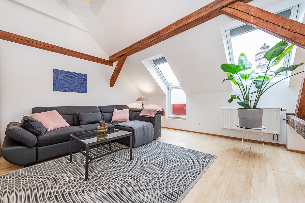 Escape to a beautifully refurbished attic studio in Prague's vibrant Žižkov district. This quiet 51m² retreat for two features a private 12m² terrace with stunning rooftop views of Old Prague. Filled with natural light, it's a stylish and serene home base, blending historic charm with modern comfort, just a short walk or tram ride from the Old Town and Main Train Station.