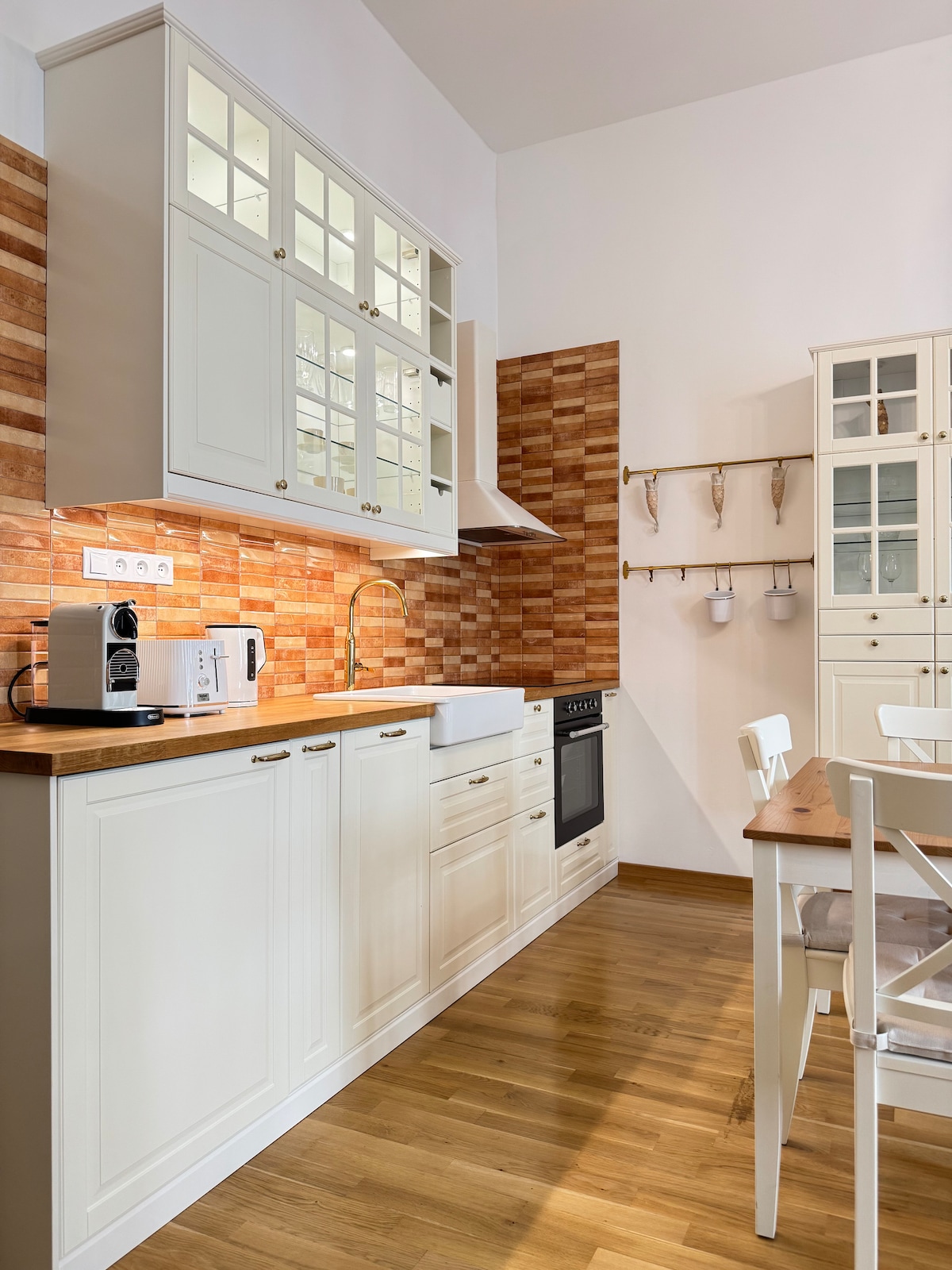 This charming, tastefully renovated three-room apartment (kitchen/diner, sitting room, and bedroom) is in an Art Nouveau building in Vinohrady (Vineyards), one of Prague’s finest and most prestigious neighbourhoods. Unfortunately, the property isn’t suitable for infants or children under 15. If a child is over 15, they’re a fully paid guest, allowing only one extra adult guest.