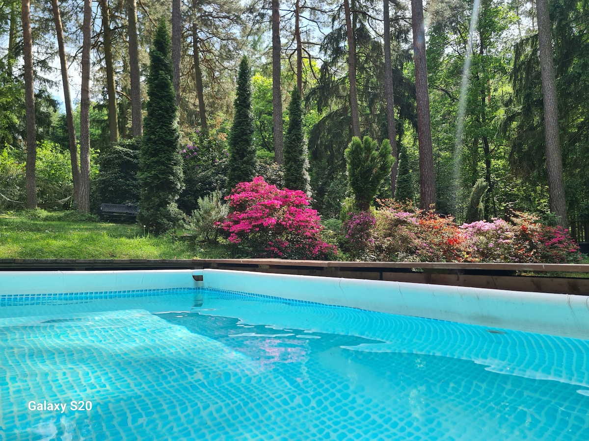 Hangulatos kunyhó az erdőben, medence és grill