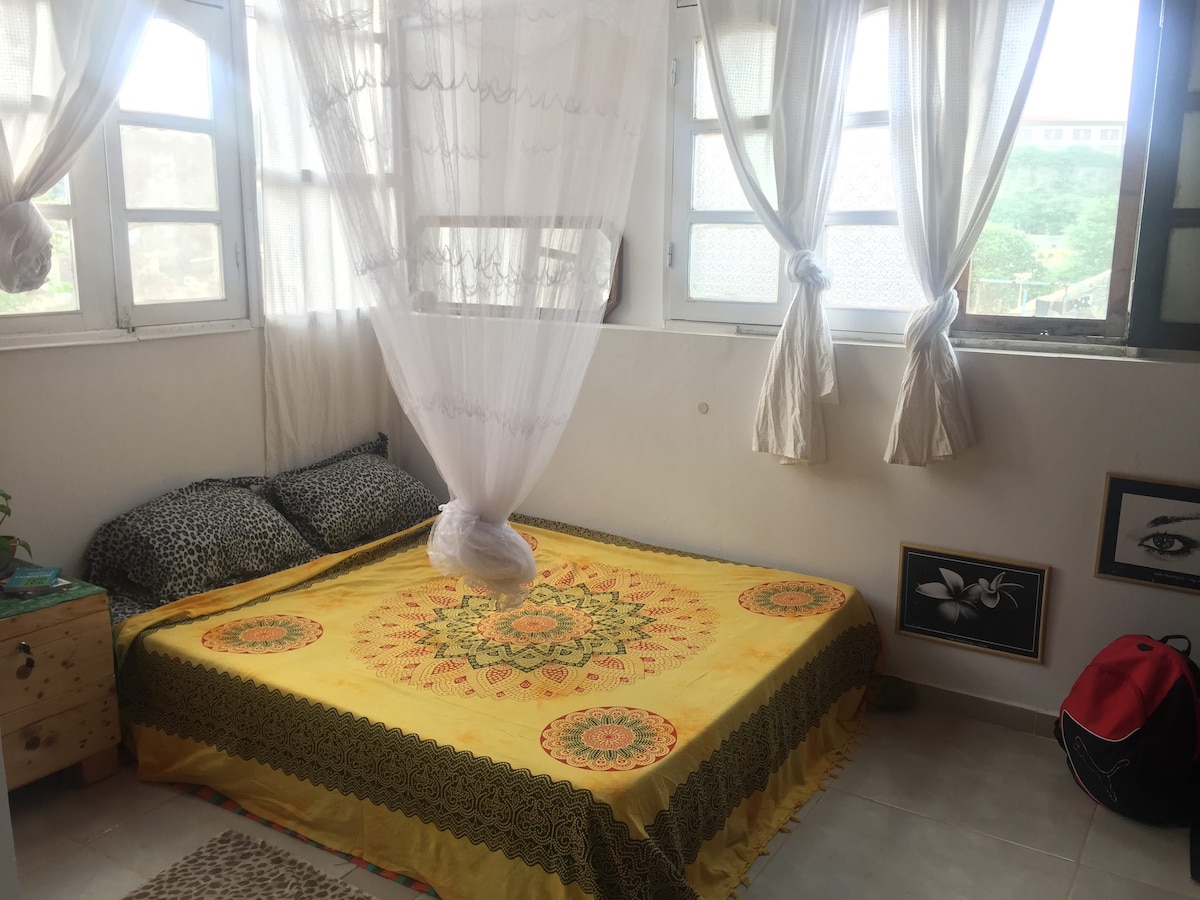 Mendes Guesthouse is In the heart of Praia, and the perfect place to meet new people and share travel journeys. We are 7 min drive from/to the airport, 5 to the Harbour and 5 min walk to the Sucupira Market, and 25-30 min to Kebra Canela Beach (most popular in Praia). First, we have to acknowledge the natural light in this room. This room accommodates a Family with one or 2 toddlers, has a wardrobe, nightstands a little table and a fan.