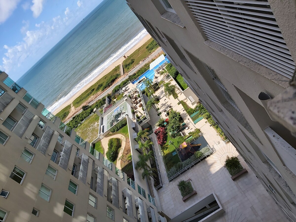 Experimente ficar hospedado num apartamento com vista privilegiada do mar, pé na areia de verdade e com piscina e jacuzzi aquecidas! O condomínio oferece 03 conjuntos de piscinas, 09 Spas, salão de jogos, quadra poliesportiva, brinquedoteca, 04 playgrounds, 03 espaços zen, pistas de caminhada, espaço pet, cancha de bocha, quadra de areia! Open Mall com cafeteria, pizzaria, petshop, decoração, mini-mercado, confeitaria, assados, lavanderia, sorveteria e muito mais!