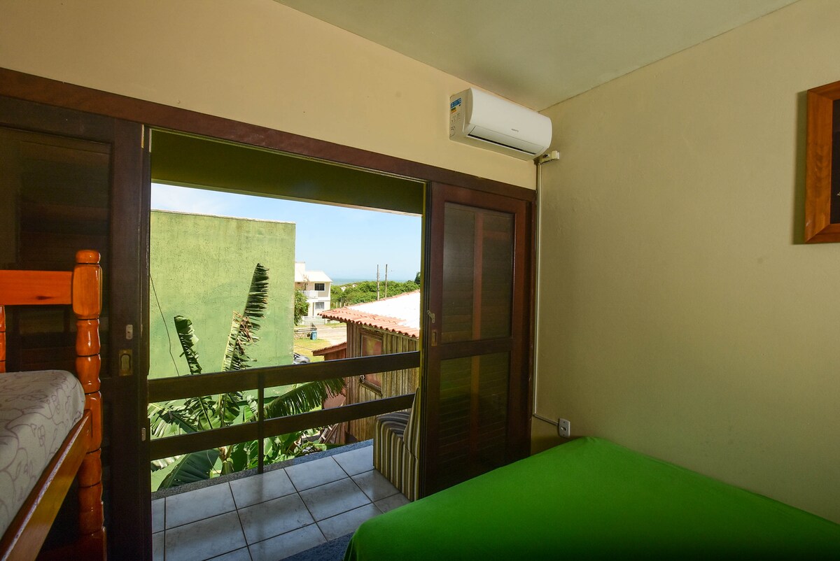 Amplia casa a 400 mts. de la playa y a 100 mts. del centrinho. Capacidad máxima para 6 personas. Acogedora y confortable. Excelente vista a la Laguna de Ibiraquera en el deck. Mirador en el punto más alto del morro con vistas al mar. Dormitorio principal en suite con cama matrimonial (sin A/C) , 1 dormitorio con 5 camas individuales y baño externo. Entrepiso con 1 cama doble. Living y cocina. Ducha exterior y parrilla. Deck externo. Estacionamiento privado para dos autos. Wi-Fi bueno y seguro.