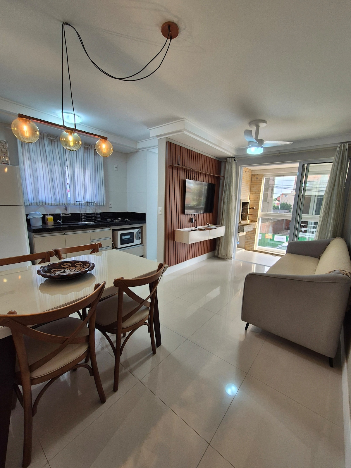 Apê excelente localização, completíssimo (até kit praia e alexa) e super aconchegante. - 1 suíte + 1 quarto equipados com cama box, colchão auxiliar, split, TV Smart e roupa de cama. - Ampla sacada com churrasqueira e rede para descanso (vista maravilhosa), arejado e iluminado pelo sol da manhã e tarde. - Cozinha equipada. - Sala com TV Smart, sofá, poltronas e ventilador de teto. Perfeito para família ou casais com filho, comportando até 4 adultos e 2 crianças. Siga @apto.bombinhas no Insta