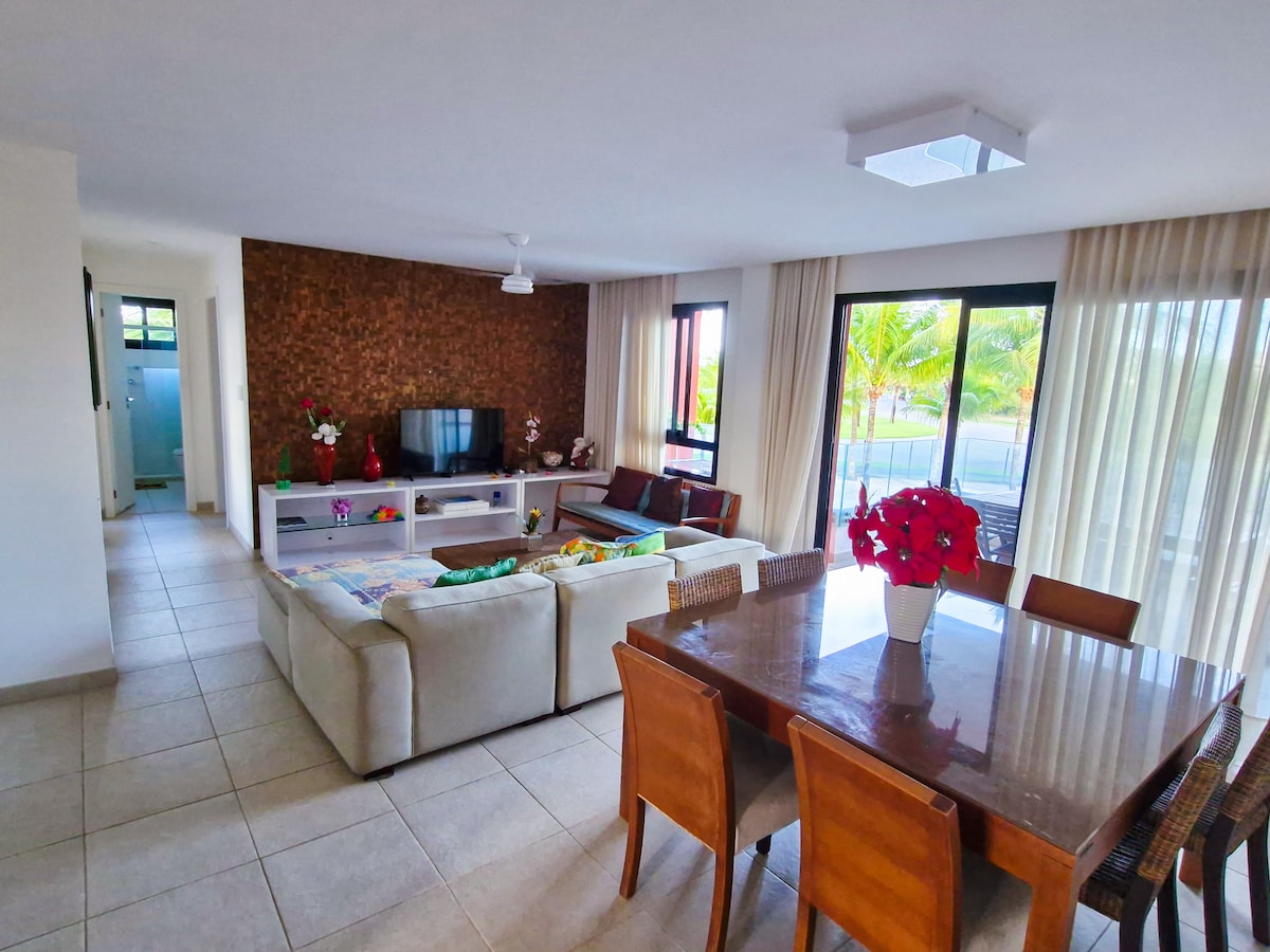 Spectacular 2-bedroom apartment (1 suite) with private garden and barbecue right by the pool inside the Iberostar Praia do Forte Complex. Very safe for families. The complex has a private beach with umbrellas and chairs on the sand for you to enjoy. We have AIR CONDITIONING in the living room and bedrooms. Fully equipped apartment: towels, bed linen, washing machine, barbecue. Perfect to explore Bahia and its beaches, staying in comfort, luxury, and 24h security. For your family: Welcome!