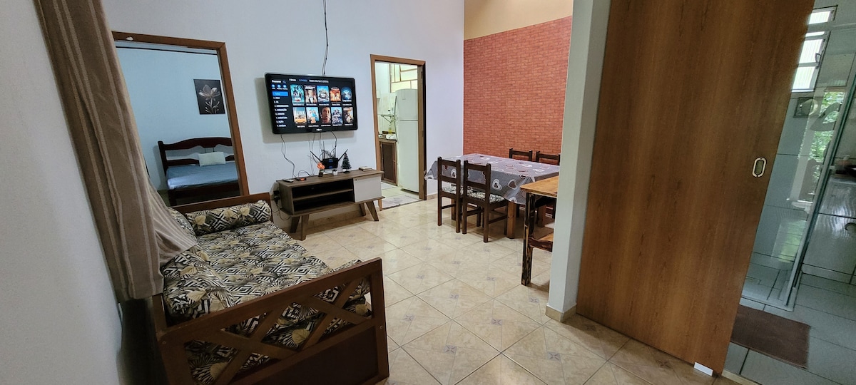 A ház az erdőben, a fák tetején található, kilátással a tengerre, a társasházon belül, a Praia do Félix jobb sarkában lévő dombon, Ubatuba önkormányzatának legszebb és legőrzöttebb részén. Itt az atlanti erdő és a hullámok hangjára ébredsz. 3 lakosztály, függőágyak, kanapék, TV DVD-vel, gyors internet és grillező áll a vendégek rendelkezésére. Ez a tökéletes otthon azok számára, akik szeretnék élvezni a nyugalmat és a természetet a világ minden nyugalmával.