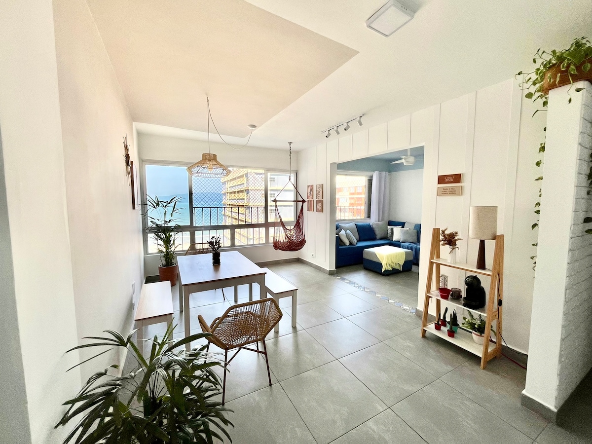 Hangulatos lakás São Vicente-Itarare nemes negyedében Praia dos Milionáriosban, teljesen összeszerelve és felszerelve, nagy sebességű Wi-Fi-vel, Smart TV-vel, ágyneművel és fürdőszobai ágyneművel, fantasztikus kilátással a tengerre, láb a homokon, magas padló, gyönyörű naplemente, panoráma az öbölre és a Pênsil hídra, közel különböző üzletekhez, például éttermekhez, bárokhoz, kisboltokhoz, szupermarketekhez, pékséghez, mosodához, kioszkokhoz stb., határozatlan idejű garázshelyiség a dátumtól függően. Egyedi élmény!!!