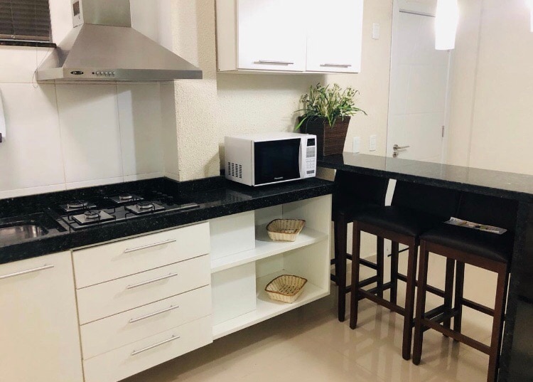 Modern and cozy apartment located in Residencial Sunny Flats, approximately 400 meters from Bombas beach in Bombinhas. It has a beautiful outdoor area with a swimming pool on the terrace, gourmet area, fire pit, games room, and kids' area. It has an integrated living room and kitchen with a dining table, a guest bathroom, 1 air-conditioned bedroom, a sofa bed in the living room, and a balcony with a private barbecue.