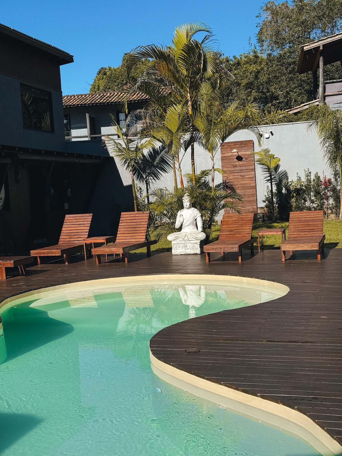 Abrace a simplicidade neste lugar tranquilo e bem-localizado. estamos apenas 700 metros da Praia do Rosa, canto norte, cerca de 15 minutos caminhando e 300 metros do centrinho, onde se encontra os melhores restaurantes e comodidades da região. nosso espaço dispõe, 2 quartos, ar-condicionado, sala cozinha integradas, churrasqueira, sacada e vista para as montanhas. oferecemos sem custo extra roupa de cama e banho que são trocadas conforme necessário. contamos com uma linda piscina com vista.