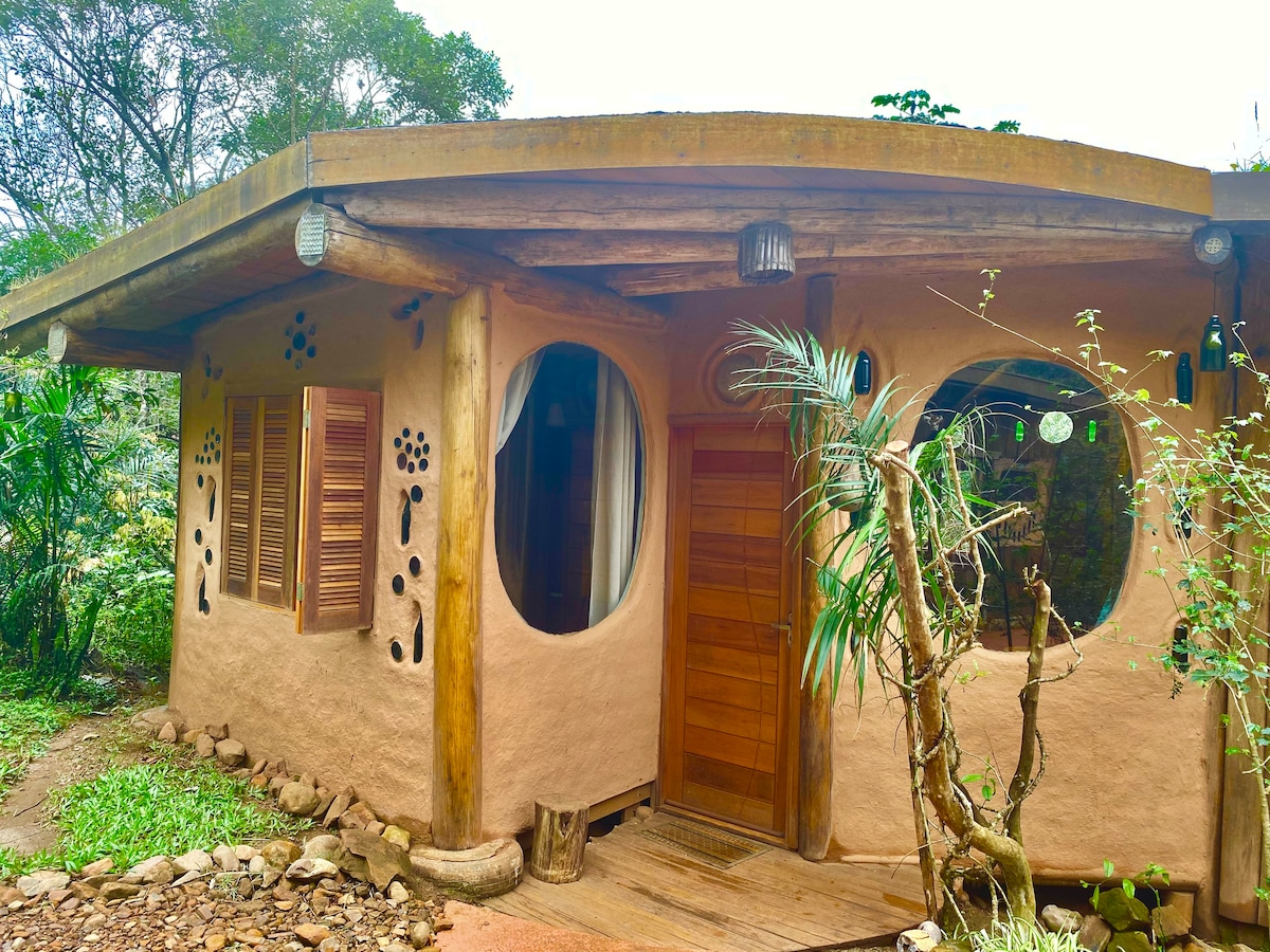Chamamos de Ecolodge ou casa ecológica porque possui tecnologias sustentáveis, como paredes de barro, telhado verde, tratamento ecológico dos efluentes, aquecimento solar e materiais reutilizados. Foi construída por nós para a nossa família. Ela tem fogão a lenha, dois quartos amplos, uma sala super gostosa, um deck atrás com vista para a floresta e um telhado verde fantástico. Perfeita para desacelerar, relaxar com os sons e cores da natureza e desfrutar a vida de forma leve.