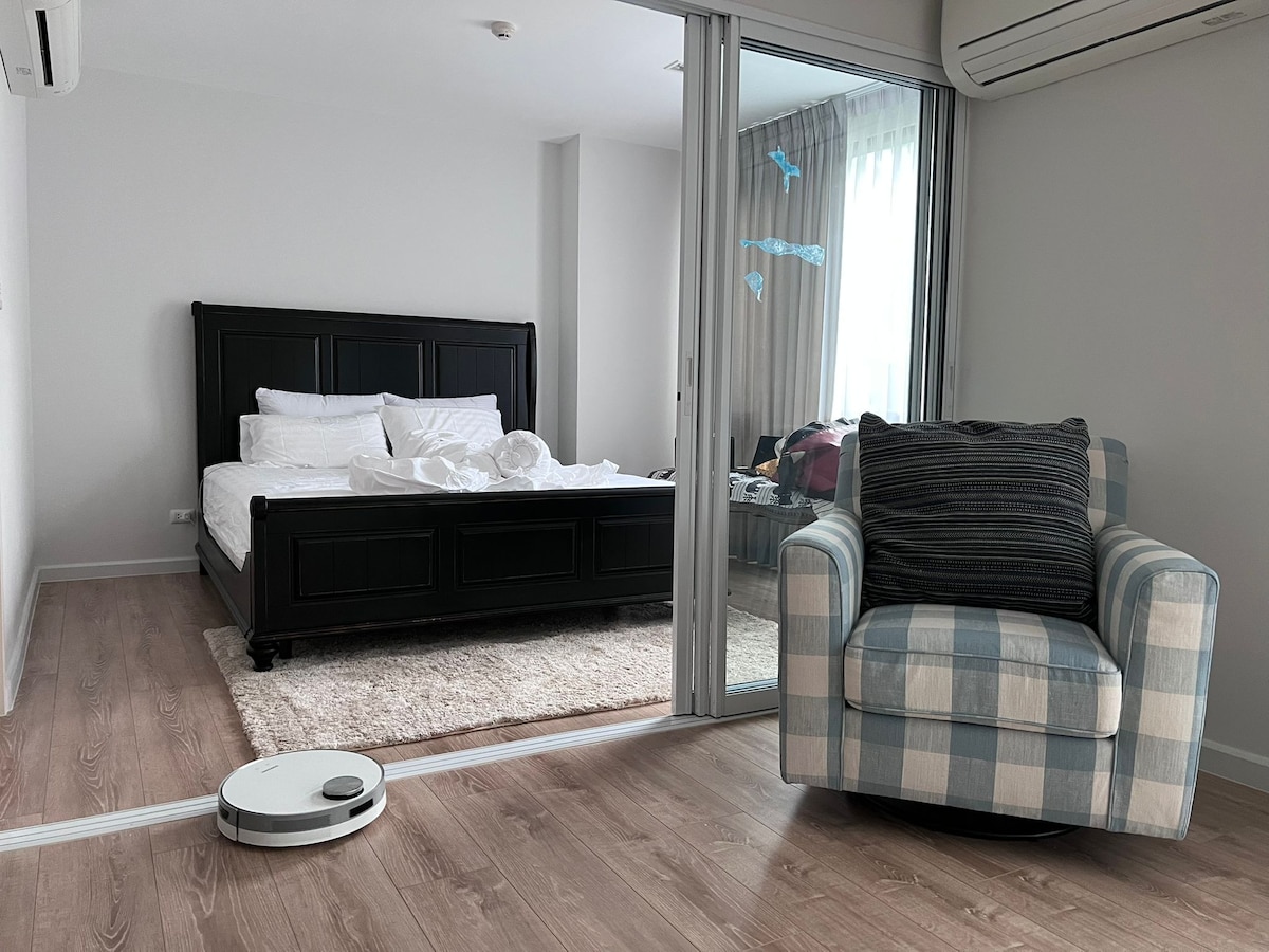 Spacious getaway directly at the beach with lush mountains in the back & the tranquil Pranburi forest park only 1 min away. Perfect for nature fans, sport lovers, remote workers or people who just want to relax The apartment has 2 bedroom, 2 bathroom incl. 1 bathtub, Sofa, TV, kitchen, working desk, balcony The building has a huge swimming pool, beachfront garden, Sauna, fitness gym & library Small local shops & restaurants in walking distance. Refill drinking water tap is under the sink.