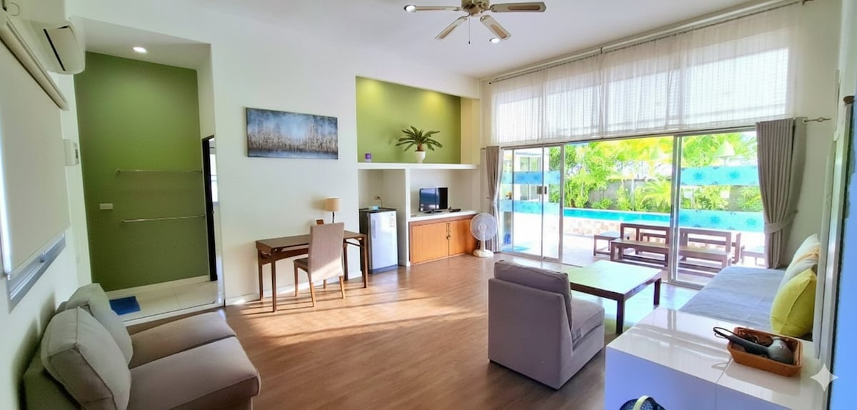 75m²/800ft², Rare Beachfront Villa, for Family & Group ! Private Pool w/ Jets | Fully Fenced 🌿 2BR (1K&1Q) + 2AC Living Room w/ Fast WiFi+Smart TV Stocked Kitchen & In/Outdoor Dining area BBQ area & Cabana In-house Washer Large Bathroom Near: 🌌 Cicada NightMarket: 15–20min 🏰 Royal Palace: 5min 🌙 Queen’s 19 Rai Night Market: 0min 🪁 Market Village: 10min 🌊 Beachfront Cafes & Restaurants: 5min Convenience: 🛒 7/11: 3min 🛒 Villa Market: 6min 🛒 Makro: 7min 👉 wishlist & click the ❤️