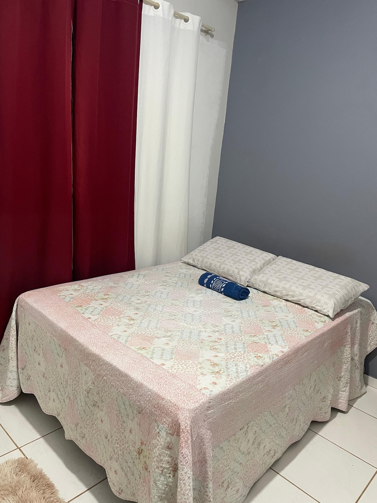 Apartamento completo, a 8min do centro, a 50metros de uma praça esportiva, lugar calmo, bem ventilado e tranquilo. O quarto conta com uma cama queen, roupas de cama, travesseiros e coberta, TV com canais abertos (tv, Netflix, youtube), ventilador (não temos ar-condicionado, mas o quarto é fresco e ventila bem), armário com cabides. Cozinha equipada com utensílios básicos, armários, fogão, geladeira. Banheiro com chuveiro quente. Garagem descoberta privativa.