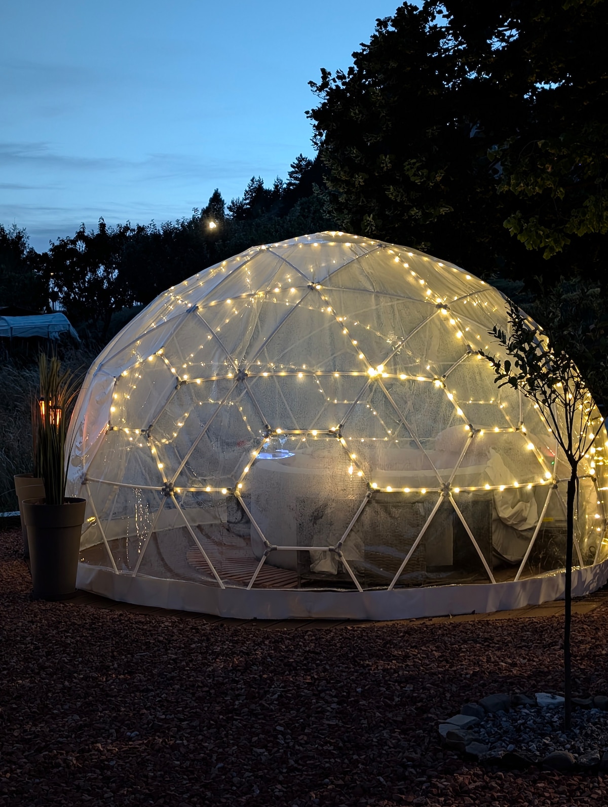 DĂ©couvrez notre nouveau dĂŽme gĂ©odĂ©sique romantique, spĂ©cialement conçu pour les amoureux en quĂȘte d'intimitĂ© et de bien-ĂȘtre. Il offre un cadre idyllique pour partager des moments privilĂ©giĂ©s. Imaginez-vous dans un dĂŽme semi-transparent, laissant pĂ©nĂ©trer la douce lumiĂšre des Ă©toiles. Plongez dans un bain Ă deux, laissez les jets masser votre corps et savourez pleinement ce moment de dĂ©tente. ĂquipĂ© d'une cuisine pratique, vous pourrez prĂ©parer de dĂ©licieux repas Ă dĂ©guster en tĂȘte-Ă -tĂȘte.
