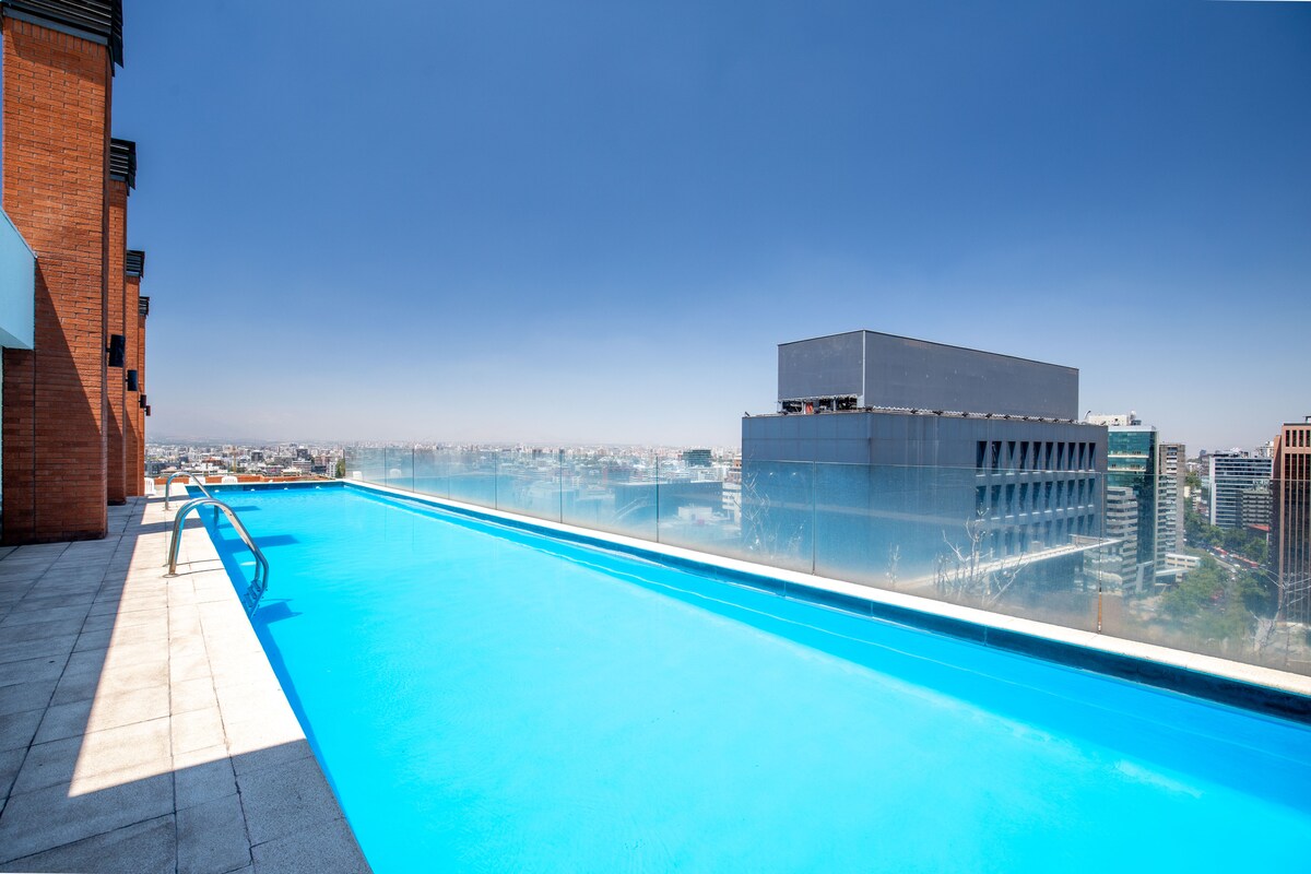 Disfrute de un moderno apartamento en el piso 21 con vistas espectaculares de Santiago, justo frente al metro Irarrázaval. Ideal para 2-3 personas, este espacio luminoso y totalmente equipado está a pasos del vibrante Barrio Italia. Incluye Wi-Fi de alta velocidad, espacio de trabajo, A/C y acceso a piscina y gimnasio en el edificio. Perfecto para trabajo o placer.