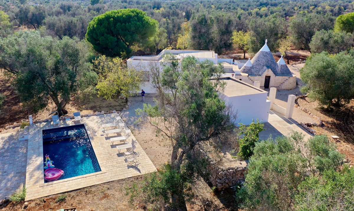 In a quiet environment a few steps from Martina Franca, between Locorotondo, Ostuni and Cisternino, this typical house of the Itria Valley has been renovated with the greatest attention to offer 4 independent double bedrooms and common living spaces. The villa has a large and bright living room; a kitchen, indoor and outdoor dining areas, a magnificent garden with trees and a private swimming pool.