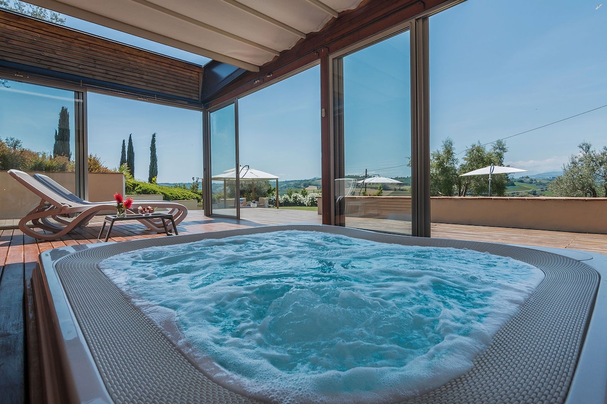 Villa Greta is a charming private villa with pool in Le Marche region, at a short distance to the Adriatic coast. The property is totally fenced-in and surrounded by a wide garden including a swimming pool with Roman stairs. Guests can benefit of a porch with table, chairs and sofas to eat and relax outside. An equipped gazebo and a veranda with Jacuzzi are present in the pool area. The villa is on three levels.