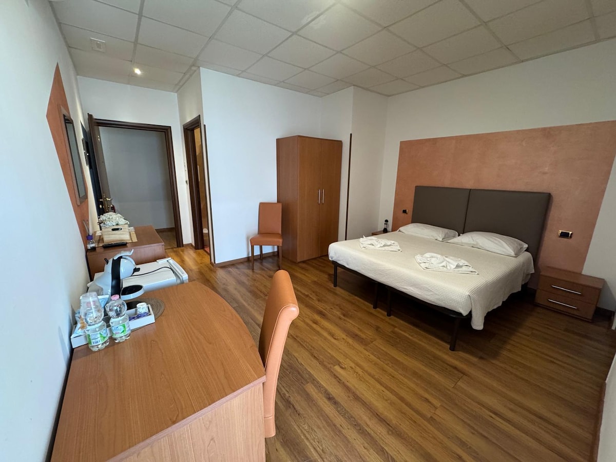 Juliet Room – 17 sqm of style and functionality A cozy, bright room with modern design, perfect for couples, friends, or business trips. The double bed can be split into two singles for flexibility. You'll find a desk with workspace, flat-screen TV, fast free Wi-Fi, air conditioning, and a coffee machine with a small welcome snack set. Four comfortable pillows ensure a personalized rest. The private bathroom is compact and elegant, featuring marble-effect tiles and a modern shower.