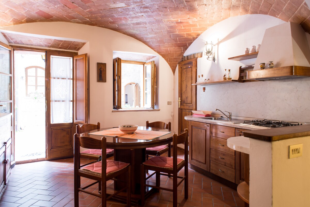 La nostra Suite più grande, grazie alla particolare architettura della Torre, ha una esposizione a 360° sulla Val d'Orcia. La cucina attrezzata è situata al secondo piano. Da qui, tramite una bellissima scala in cotto conservata senza alcuna modifica e la parete in pietra a faccia vista, si accede al terzo piano dove troverete la camera da letto e la sala da bagno.
