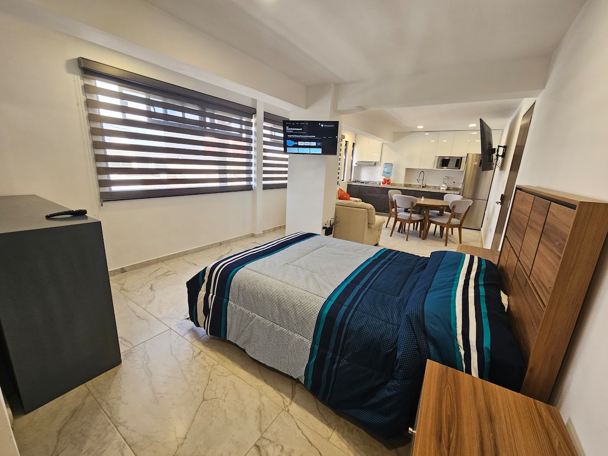 - Üzleti stílusú apartman ipari stílussal. Élvezd a szállást egy új és modern lakásban, kiváló kényelmi szolgáltatásokkal és rendkívüli helyen. - Minden szükséges kényelmi szolgáltatással rendelkezünk, hogy a szálláshelyen töltött időd a lehető legélvezetesebb legyen. Légkondicionálás, nagy sebességű wifi. - Élvezd az éttermek, bárok és érdekes helyek széles választékát, amelyeket az Av. Juárez és Cerro de la Paz csak néhány percnyire van.
