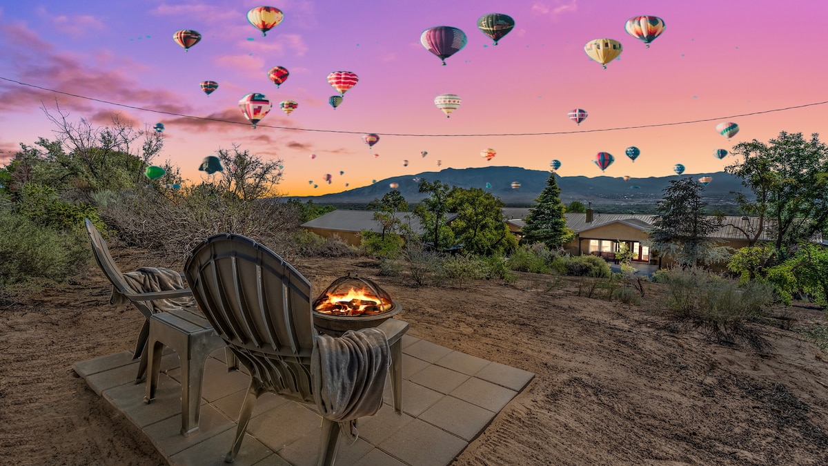 Lenyűgöző nyugati stílusú otthon, amely elég nagy az egész családnak Santa Fe és Albuquerque között. •Két hálószoba, egy teljes fürdőszoba. •king-size ágy, teljes méretű ágy és egy kétszemélyes ágy kötéllel. •Nagy nappali és konyha a családi időhöz. •Terasz, ahol este pihenhetsz, vagy reggelente kávét és léggömböt nézhetsz. •Tíz percre a Balloon fiesta parktól • Parkolási lehetőség két garázsban vagy előkertben. • Tökéletes hely az NM gyönyörű hegyeinek felfedezéséhez.