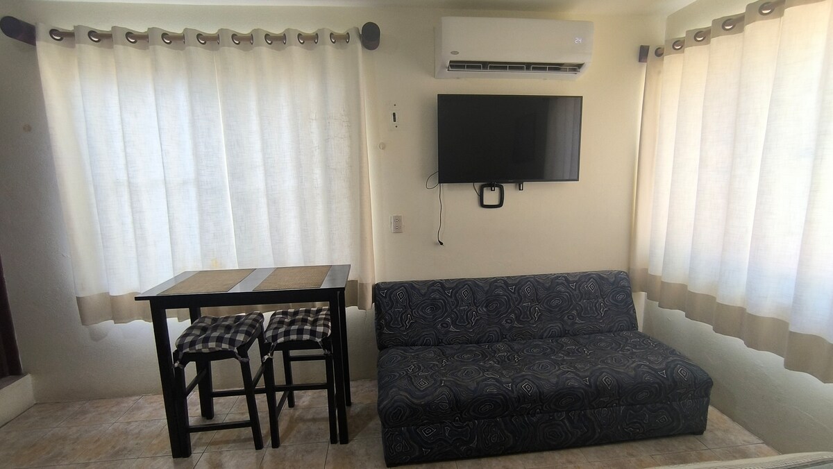 Cómodo mini departamento, con una habitación muy amplia y todo lo necesario para una estancia agradable y placentera, cuenta con una cama matrimonial, un sofá cama, cocina equipada, un baño amplio, aire acondicionado, smart tv con netflix, Internet y una excelente ubicación, muy cercana a las partes más visitadas de nuestra ciudad.