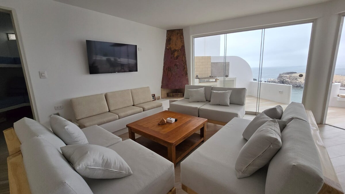 🌊 Gyönyörű, közvetlenül az óceánparton álló ház közvetlen tengerparti hozzáféréssel és látványos kilátással. Ideális nyaraláshoz párként, családdal vagy barátokkal. Öt hálószoba, négy teljes fürdőszoba, saját medence, grillterület, agyagkemence és Starlink-internet. Kiváló elhelyezkedés: 5 percre a Cerro Azul mólótól és éttermektől (20 perc sétára a homokon), 15 percre Ázsiától és 1 órára Lunahuanától. Tágas és tökéletes helyek a pihenéshez és az együttléthez.