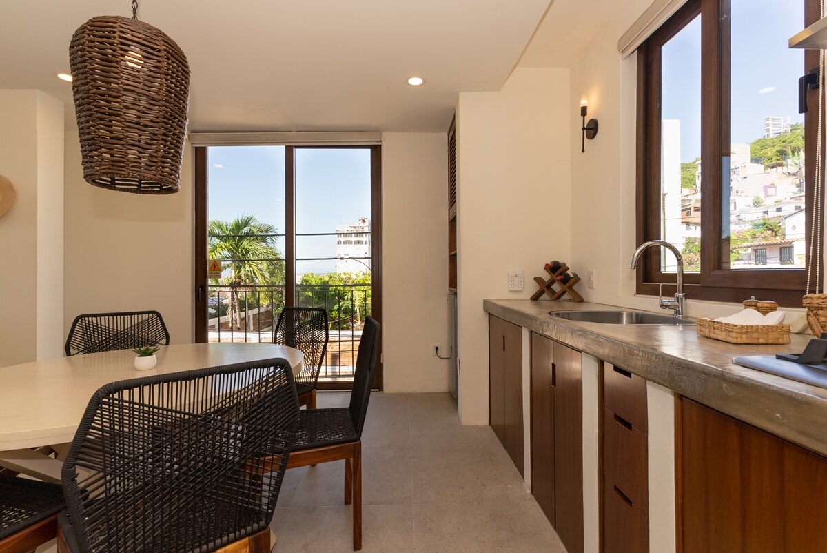 Relax in this modern oceanview studio in the heart of Puerto Vallarta. Enjoy a comfy bed, high-speed Wi-Fi, and a fully equipped kitchen. Unwind in the heated pool, jacuzzi, or gym, all with stunning ocean views. Steps from restaurants, shops, and the beach, and close to the Malecón and Zona Romántica. Perfect for couples or solo travelers seeking style, comfort, and seaside tranquility.