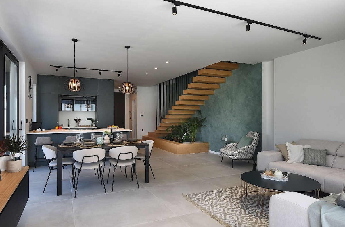 Lépj be Lillian dizájnlakásunk elegáns világába! Élvezd az étkező- és lakóterek zökkenőmentes keverékét, amelyet kortárs mediterrán bútorok és padlók díszítenek, és amelyek egy 4 csillagos élménnyé emelik a szálláshelyen eltöltött idődet. Legyen szó akár egy kétszemélyes, családi kiruccanásról vagy egy különleges ünnepségről, gondoskodunk rólad. És természetesen a jellegzetes teraszunk ellopja a műsort egy lenyűgöző társalgóval, ahonnan panorámás kilátás nyílik a tengerre. A tökéletes menekülésed csak egy foglalásra van!