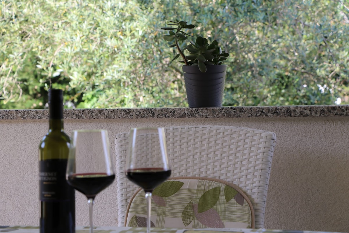 Jól felszerelt, tiszta és modern lakás található, mindössze 300m-re a strandtól, csendes környéken, nagy terasszal és az összes szükséges árut. Ez az oázis, ha szeretne pihenni, és élvezze a látványos kilátás nyílik a tengerre és a közeli szigetekre és a mediterrán kertben. Házunk kisállatbarát, de külön díjat számítunk fel a háziállatokért.