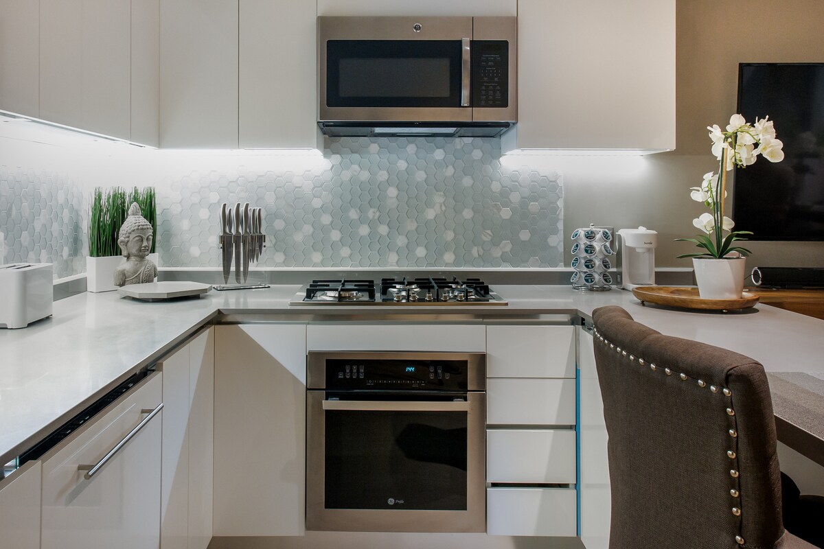 This luxury studio loft is an interior facing unit on the first floor near the lobby. It's interior location provides a quiet respite from the outside noise and offers a zen-like atmosphere, complete with Buddha motifs, luxury linens and a big flat screen TV. This fully equipped studio provides all the creature comforts that reminds you of home, from complimentary gourmet coffee and teas to extra pillows and USB ports.