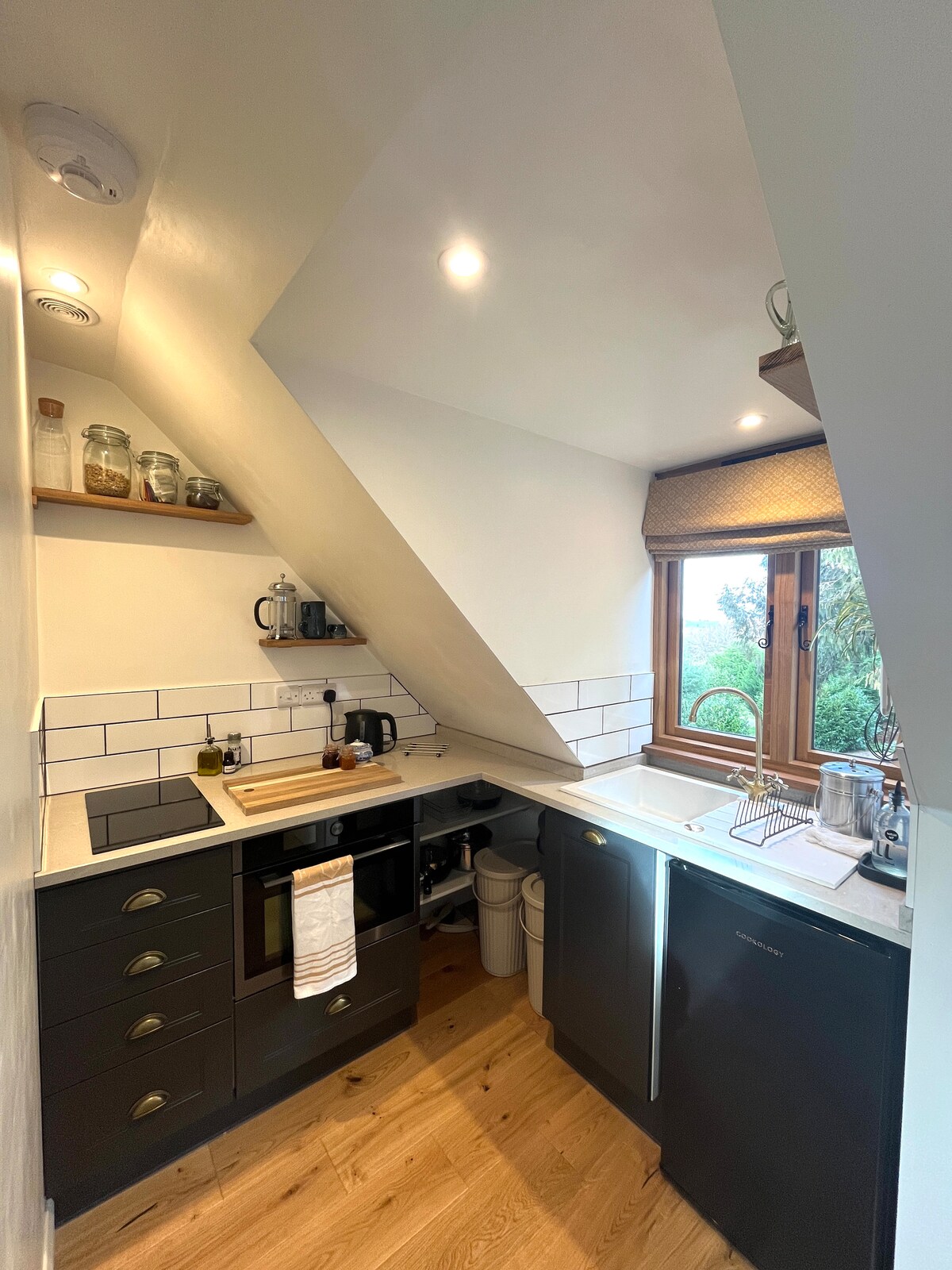 Az egyedülálló bádoglapátot fenntartható és újrahasznosított anyagok felhasználásával tervezték, helyi művészektől származó eredeti műalkotásokkal és természetes fénnyel töltve. Fával van bélelve, ami meleg és természetes környezetet teremt, és faégővel is rendelkezik. Kompakt, jól felszerelt konyha, nappali, földszinti fürdőszoba zuhanyzóval és WC-vel. Az emeleten van egy nagylelkű hálószoba Super király vagy kétágyas, és gyönyörű kilátás nyílik a gördülő vidék egy kép ablakból. Odakint van egy terasz és egy tűzrakóhely.