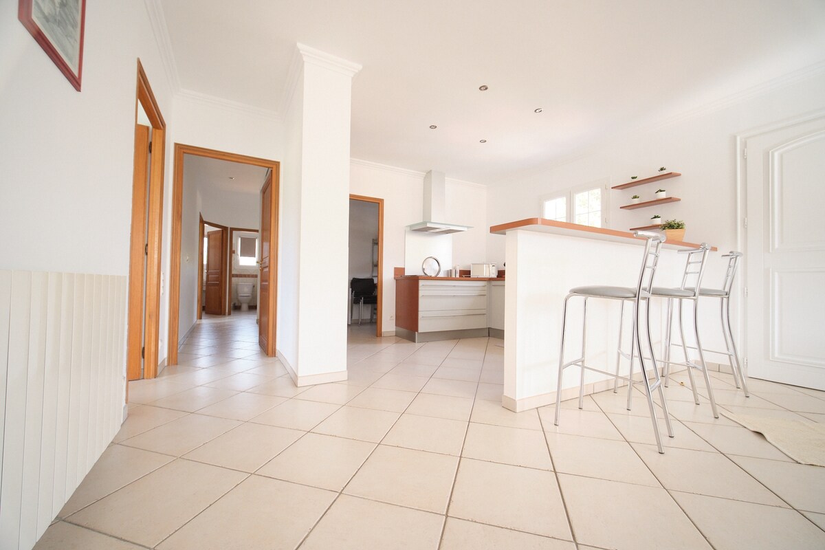 A Villa JUWEN a következőkből áll: * 2 gyönyörű, 12 négyzetméteres hálószoba TV-vel. * 1 fürdőszoba, 1 külön WC. * 1 felszerelt konyha, amely a nappalira nyílik egy nagyon jó minőségű kanapéval. Kint egy gyönyörű, 70 m² -es terasz található 6 fős kerti bútorokkal, egy planchával és 4 napozóággyal. A medence 6mx3m, és áprilistól októberig fűtik.