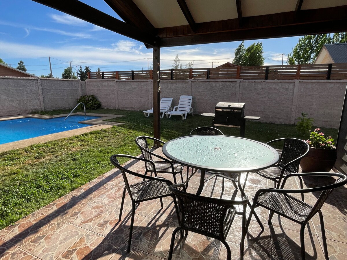 Crea recuerdos inolvidables en este alojamiento único y familiar. Disfruta de un ambiente tranquilo con vista a Laguna Avendaño en un amplio espacio con piscina y área verde. Casa con amplias dependencias y un ambiente elegante para disfrutar y relajarse. Sobre la cantidad de 6 personas tiene un recargo ad. de $5.000 CLP por persona lo cual se resolverá en el Centro de solución para revisar el caso. Cuenta con tinaja para 6 pers. (dentro del arriendo en baja temporada y costo ad. temp Alta)