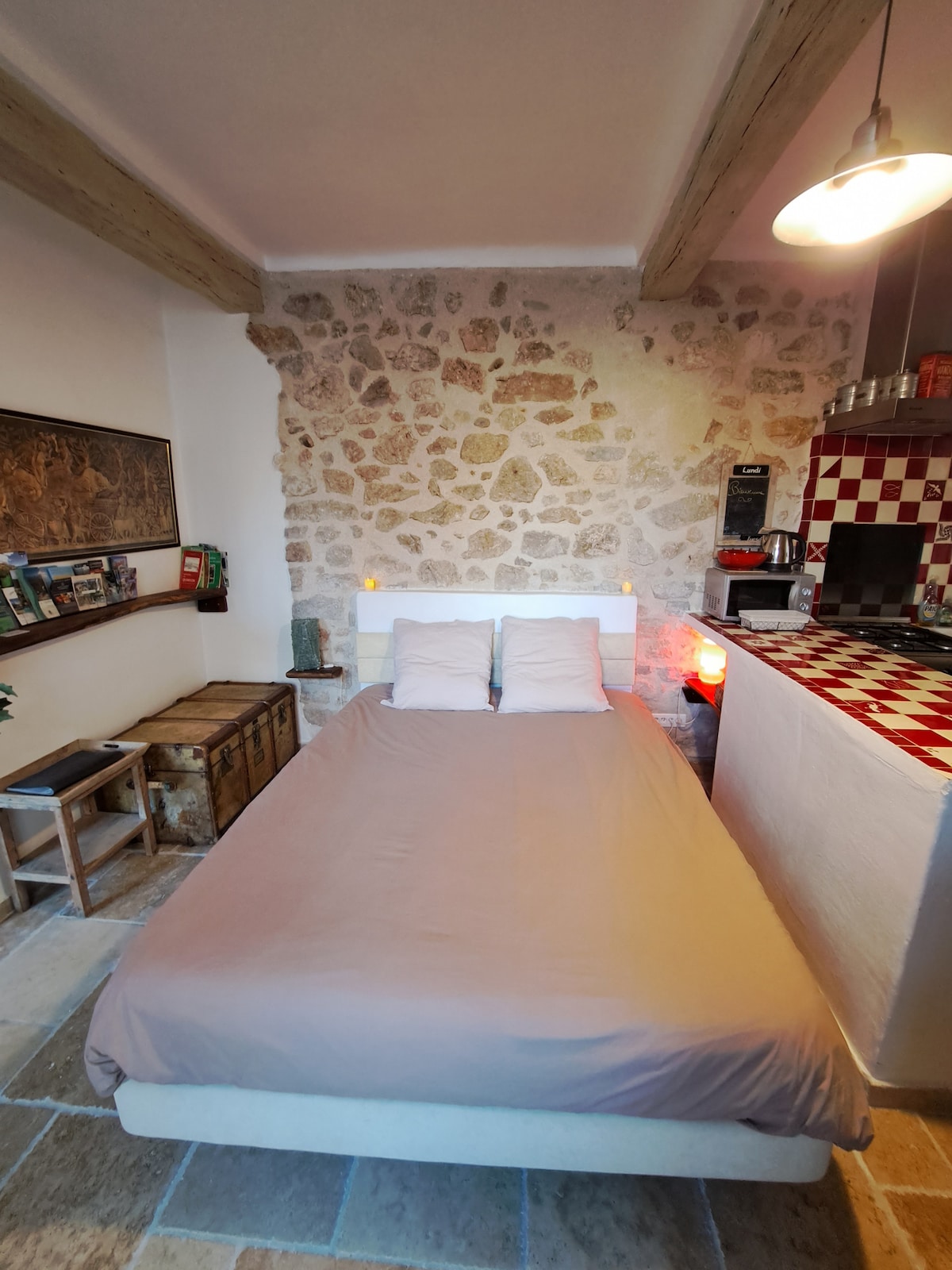Bienvenue dans votre studio "Coeur de Verdon" qui est au rez-de-chaussée de notre maison de caractère du 16ème siècle, rénovée par nos soins, labellisée par la Fondation du Patrimoine et dans laquelle a vecu Charles Aznavour au début des années 40. Il se situe au coeur du village de Quinson, à deux pas de l'église et de notre bar "Le petit duc". Un parking gratuit de 4 places est disponible à côté du logement. Linge de lit et frais de ménage inclus.